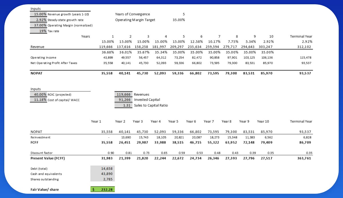 26. Gives us a fair value of $232+, well above the current market price of $184. Adjusting the revenue growth to 10% gives us a price of $194, market is pricing in around 8.5%. Keep in mind analysts estimate around 11% over the next 5 years, and Meta has never done <21% 🤷🏽‍♂️🤷🏽‍♂️