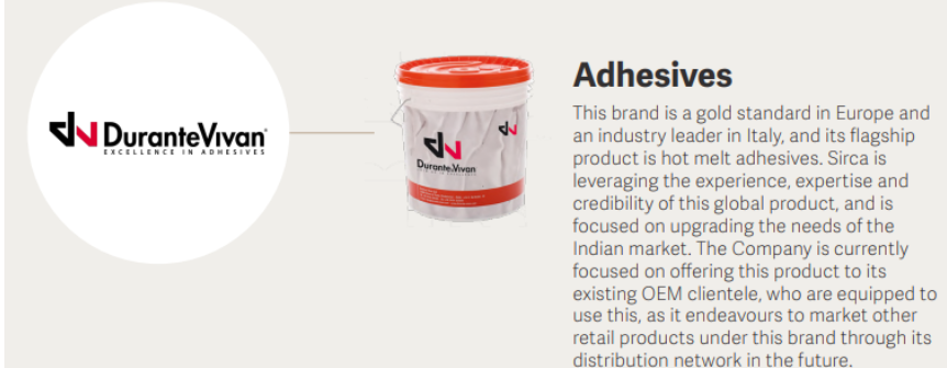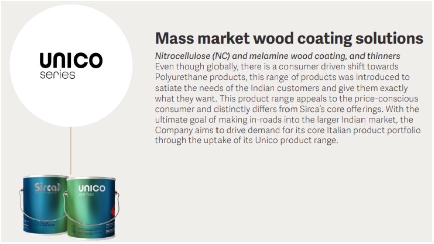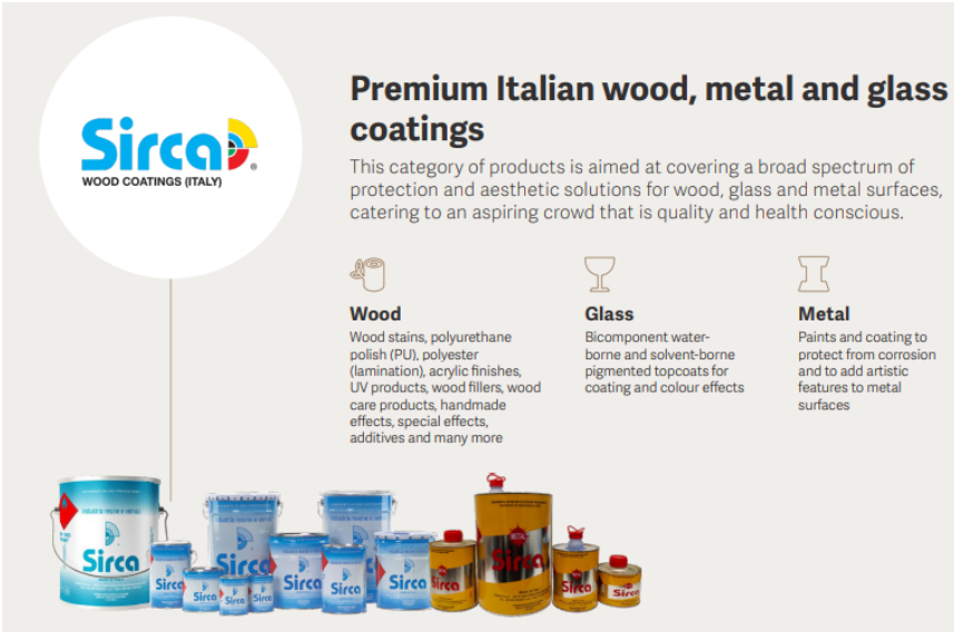 The Company is engaged in the manufacturing & sales of wood coatings and other decorative paints, under its owned or exclusively licensed brands like Sirca, Unico, San Marco & DuranteVivan, and is also geared to begin exporting its products.