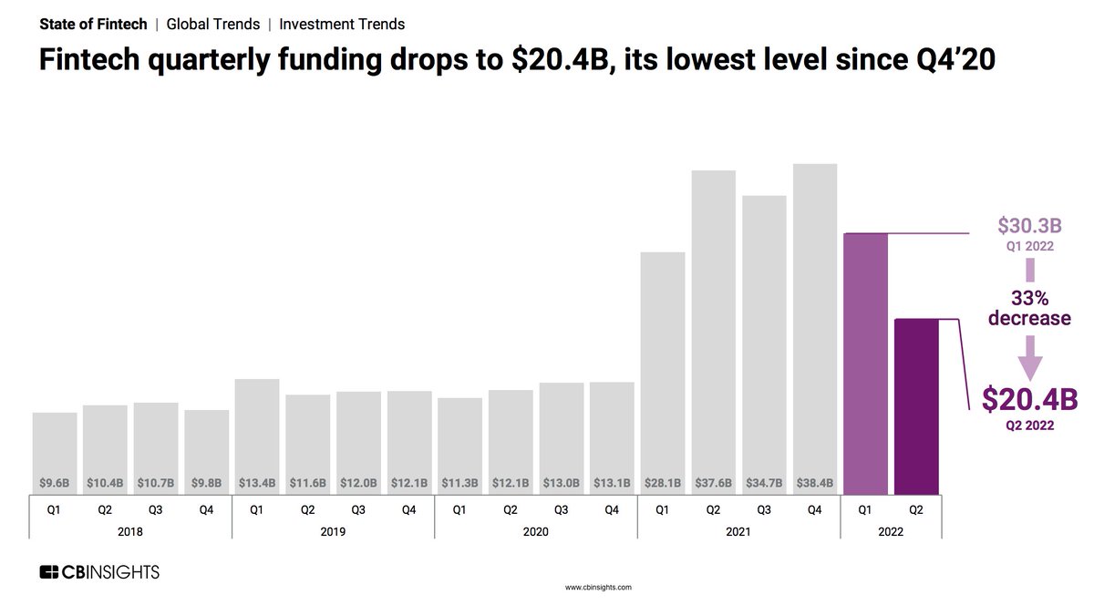 - بشكل عام، الانخفاض في الربع الثاني 2022 هو نتيجة تراجع الاستثمار في الشركات الناشئة في مجال التقنية المالية وسط تقلبات السوق والركود الاقتصادي الذي يلوح في الأفق.
