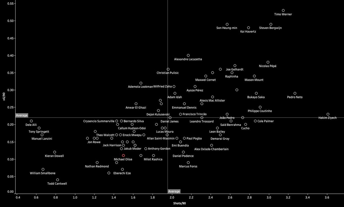 Goal Threat An area where Olise can definitely improve is his goalscoring, he takes a very low amount of shots/90 and therefore has a very low value of expected goals. His goal tally of 2 in the Premier League last season will undoubtably be improved on with age and maturity.