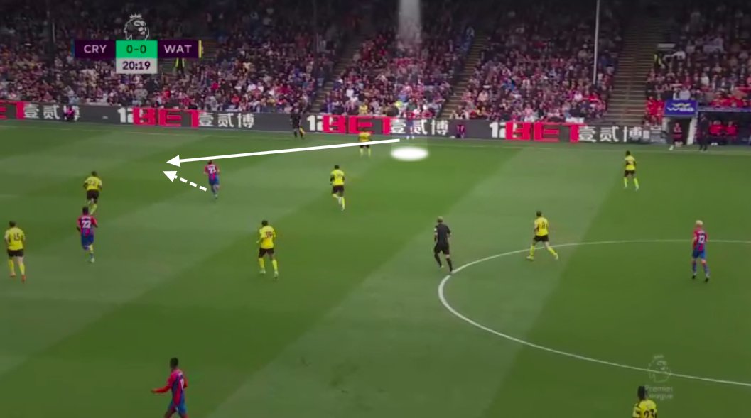 Michael Olise plays on the right wing in Patrick Vieira's 4-2-3-1 / 4-3-3. Olise likes to hold the width when Palace are in possession before receiving the ball and driving at the fullback choosing to either cut inside onto his favoured left foot, or dribble to the byline.