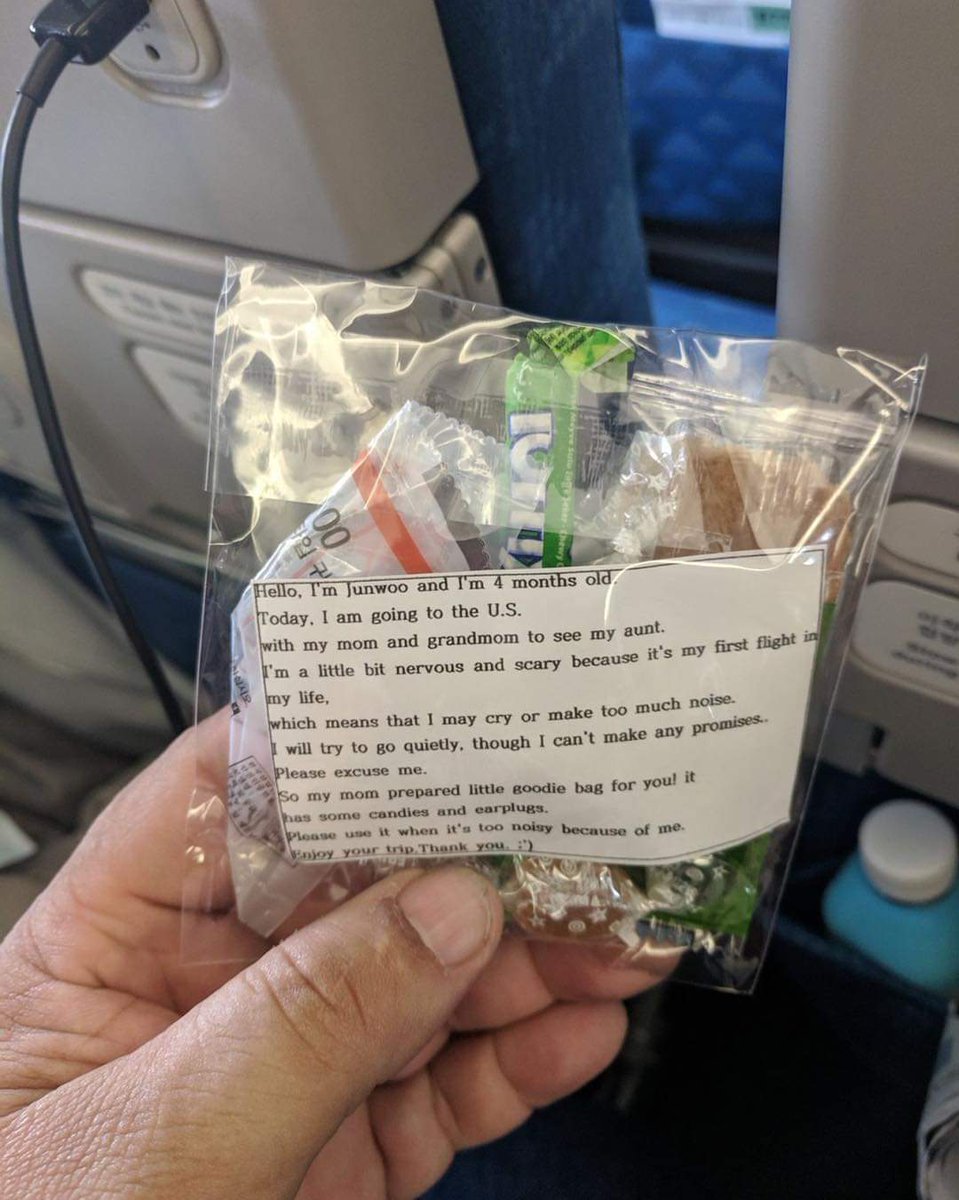 The bag contains candy, chewing gum and earplugs as a kind of advance apology for using them in the event that her 4-month-old baby screamed during the flight.