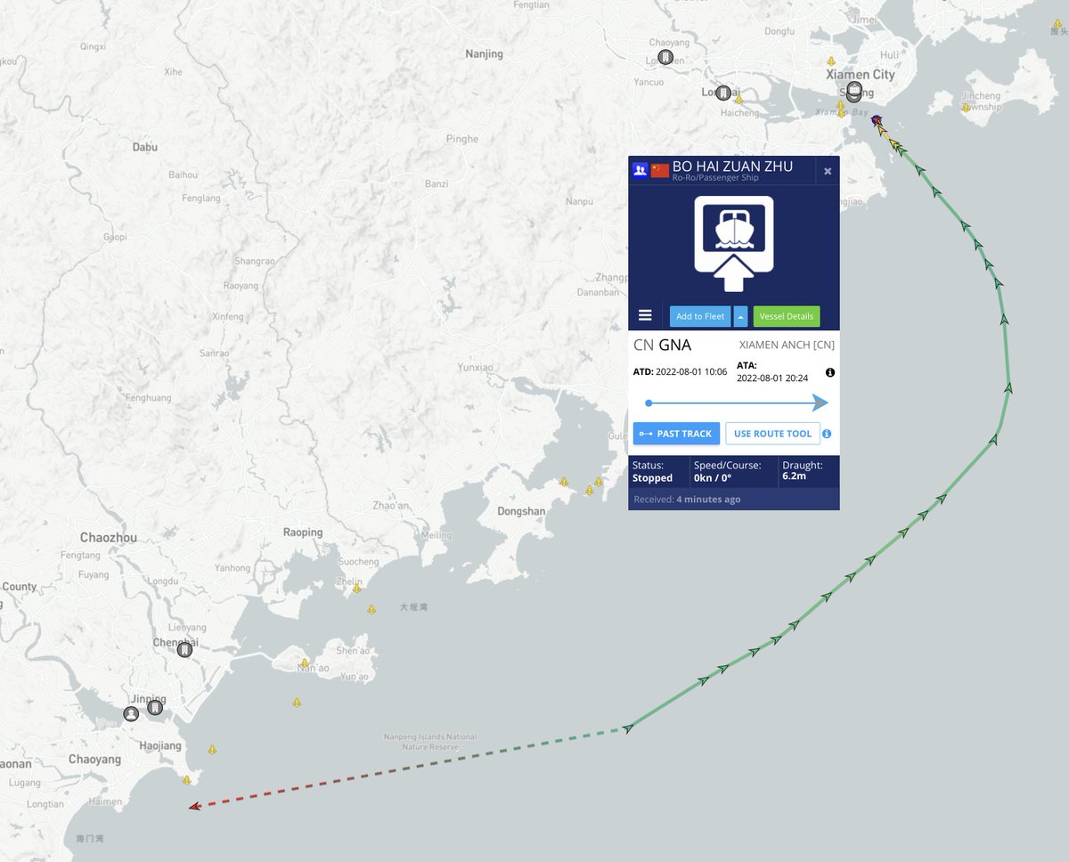 @MarineTraffic AIS data shows that this ferry left the Bohai Gulf after a port visit to Tianjin (near where it loaded tanks in 2021) and is now transiting southbound toward the northern approaches to the Taiwan Strait. Its destination is Shantou, across the Strait from S Taiwan.
