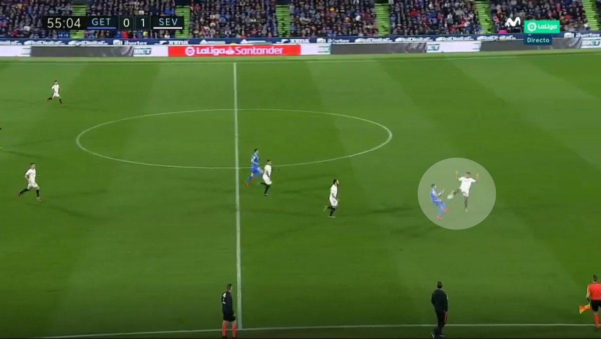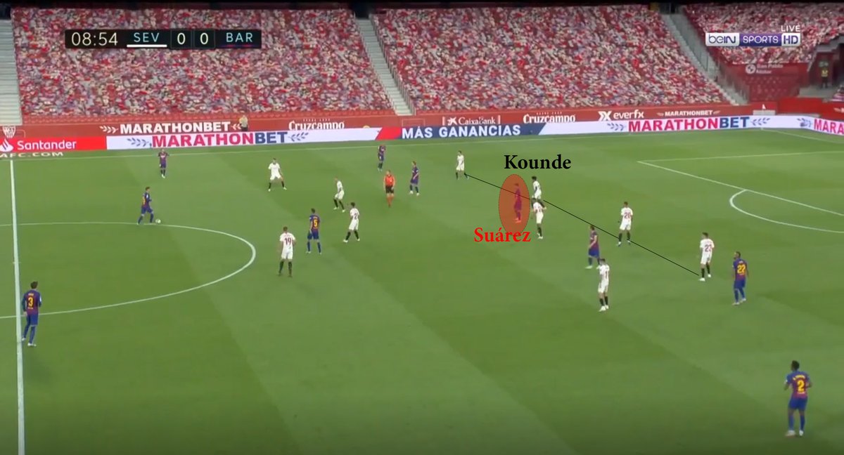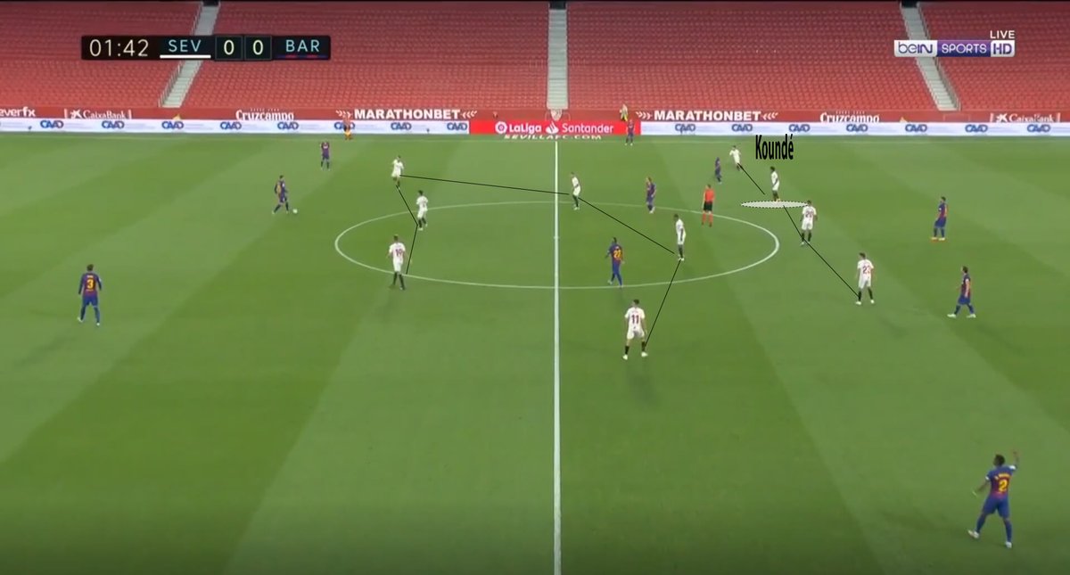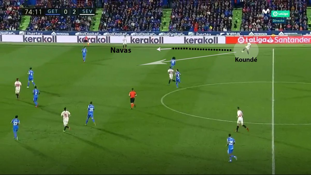 One of KoundĂ©âs big strengths is his performance in individual defensive duels, whether on the ground or in the air, which made him win many balls for the Sevilla team in the possession stage. Once he does that,