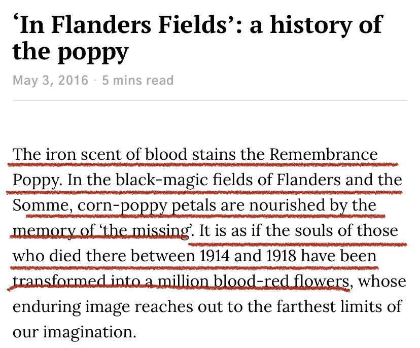 This article is from a military history site - ‘In the black-magic fields of Flanders and Somme, corn poppy petals are nourished by the memory of the missing’. Poppies grew along the River Lethe, and took the memories of the dead