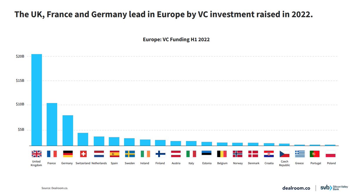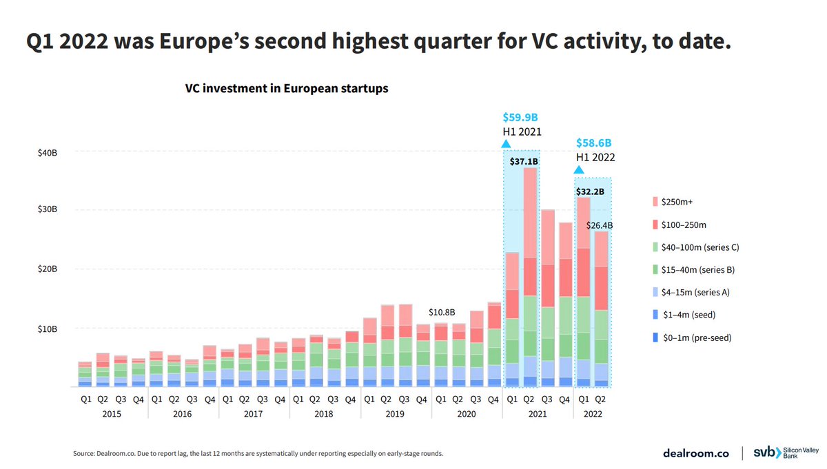 من تقرير ديل روم عن نشاط رأس المال الجريء في أوروبا في النصف الأول من 2022. جمعت الشركات الناشئة الأوروبية 58.6 مليار دولار في النصف الأول 2022 وبذلك يكون النصف الأول 2022 ثاني أعلى نصف سنوي بإجمالي استثمارات رأس المال الجريء بعد النصف الأول 2021 والذي كان 59.9 مليار دولار.