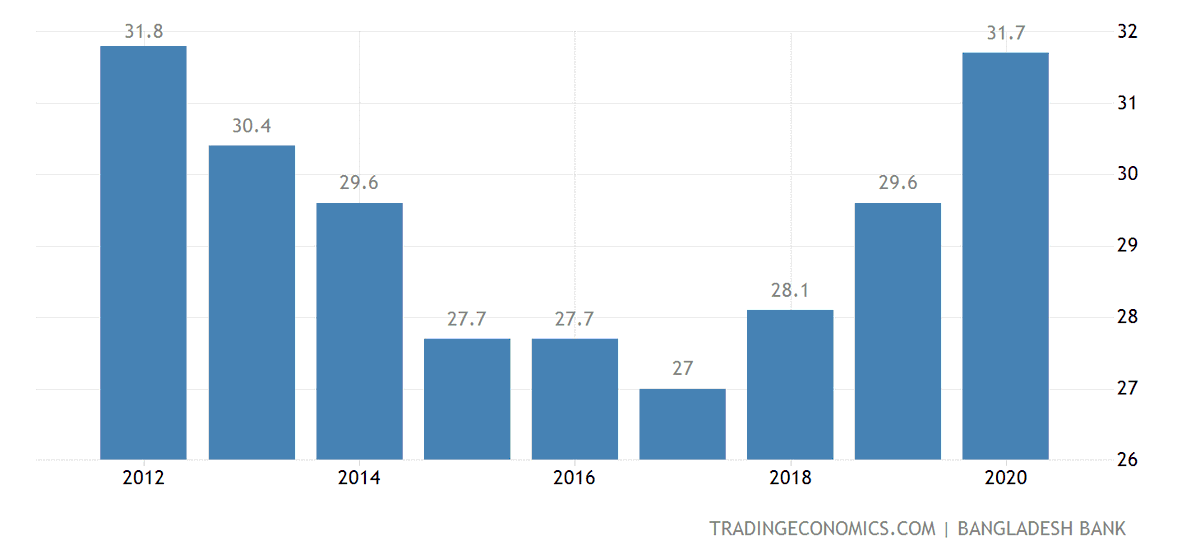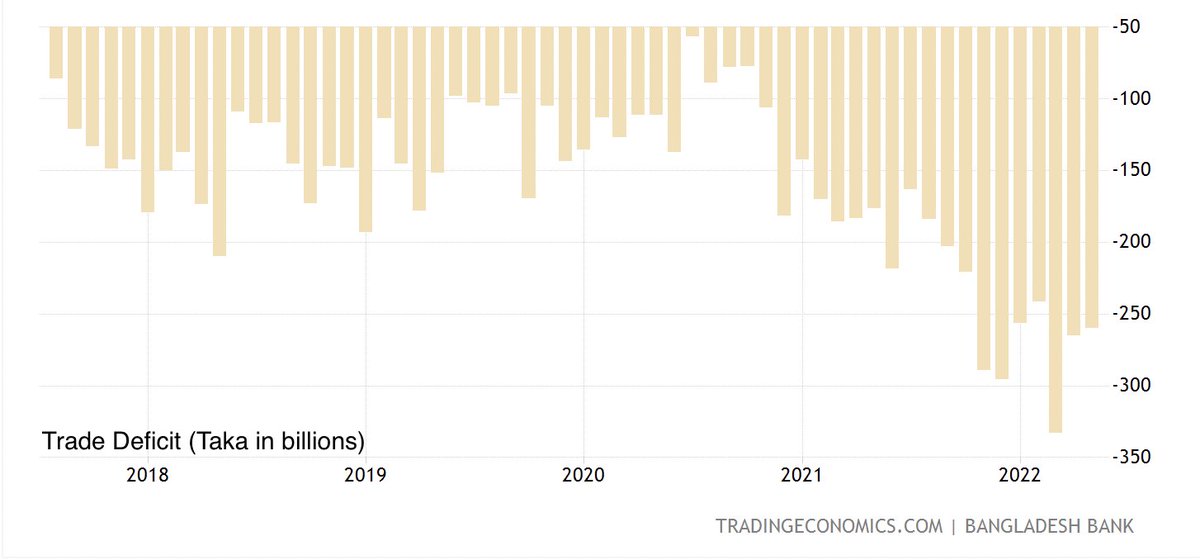 The currency is also in a freefall which makes the position even more difficult. Despite adopting a floating exchange rate back in 2003, Bangladesh has fixed an official exchange rate to make the Bangladeshi Taka artificially strong against the dollar.