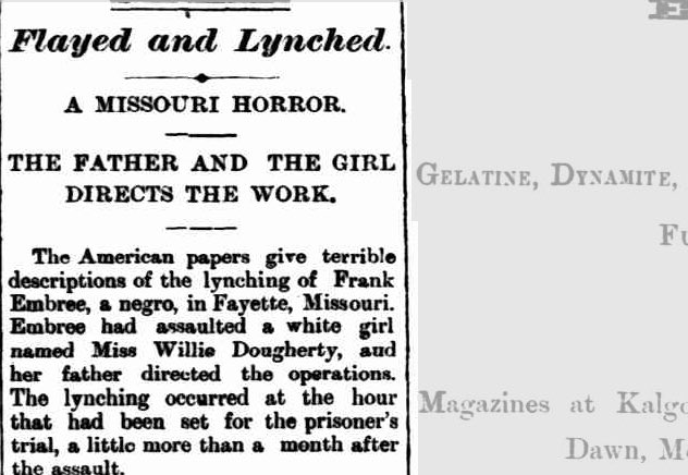 Embree, his body covered in blood from the whipping and skinned, with no courtroom or legal system in sight, offered a confession to the waiting lynch mob and was immediately hanged from a tree.