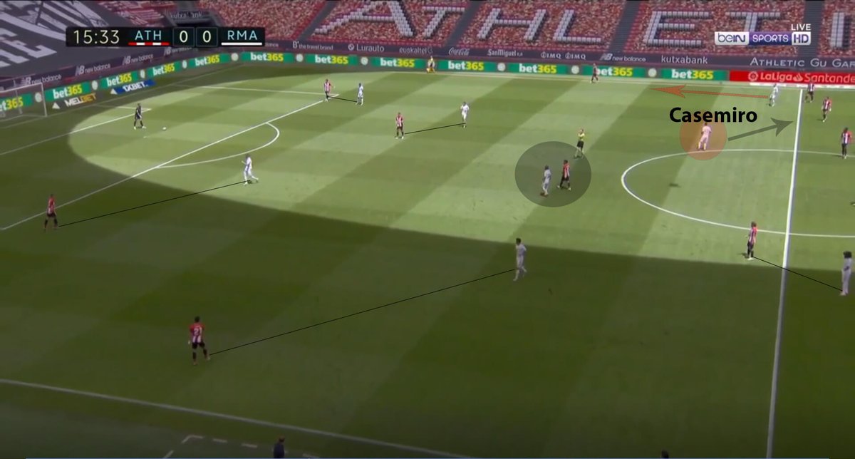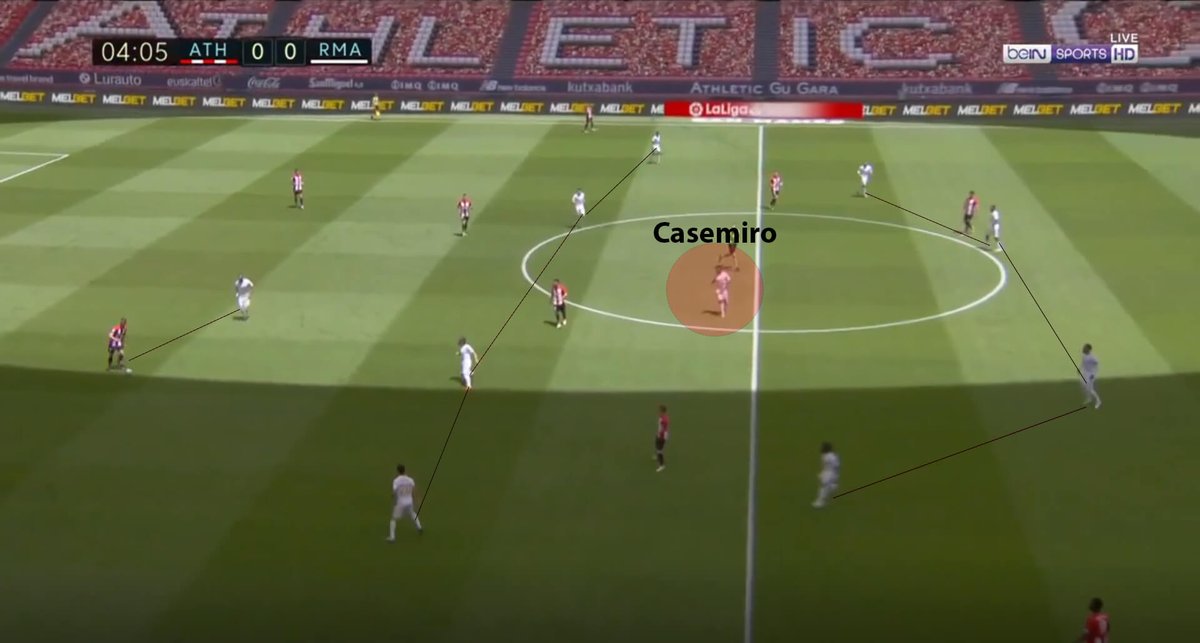 Here we can see when the ball was with the goalkeeper of Athletic Club, the positioning of Casemiro like third-back between Sergio Ramos and Eder Militao, to make the width of the defensive line and cut the ball lanes toward Raul Garcia.