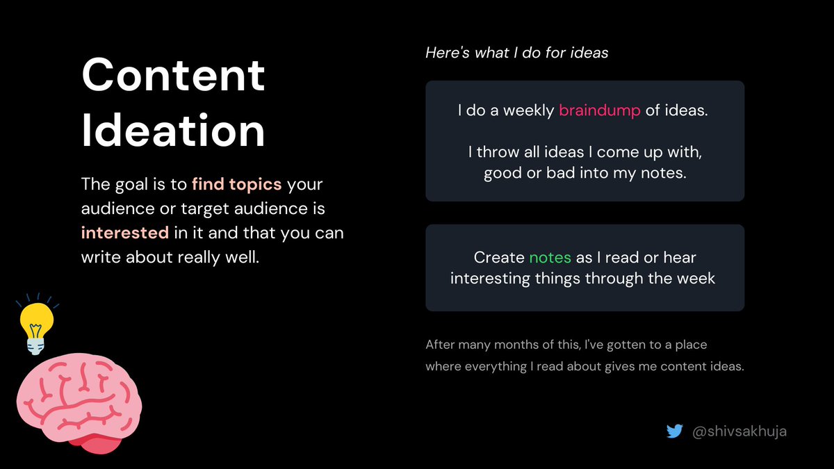β’ I do a weekly braindump of ideas. I throw all ideas I come up with, good or bad into my notes.