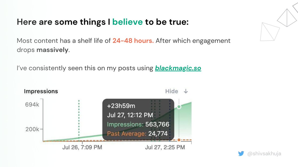 1. Most content has a shelf life of 24-48 hours. After which engagement drops massively. Iβve consistently seen this on my posts using @blackmagic_so (created by @tdinh_me).