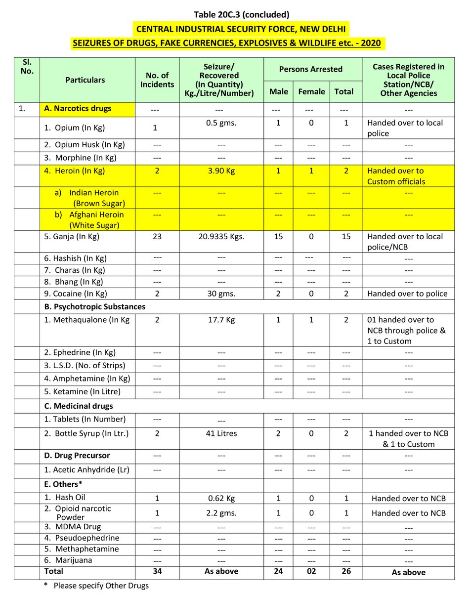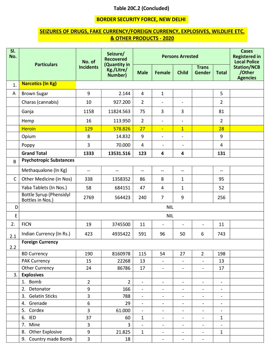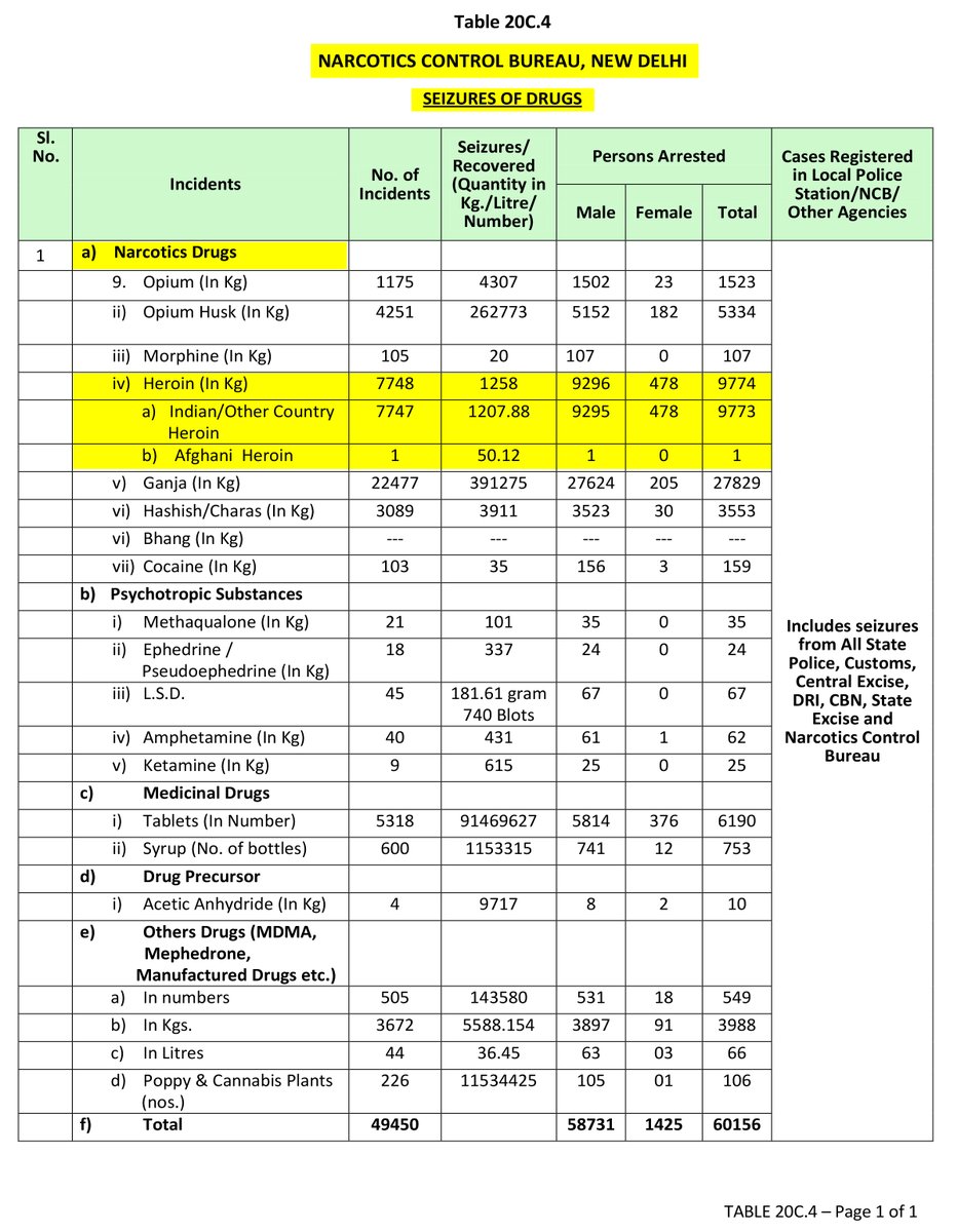 Check out the details of heroin seizures by other agencies reported in 2020 NCRB-Report