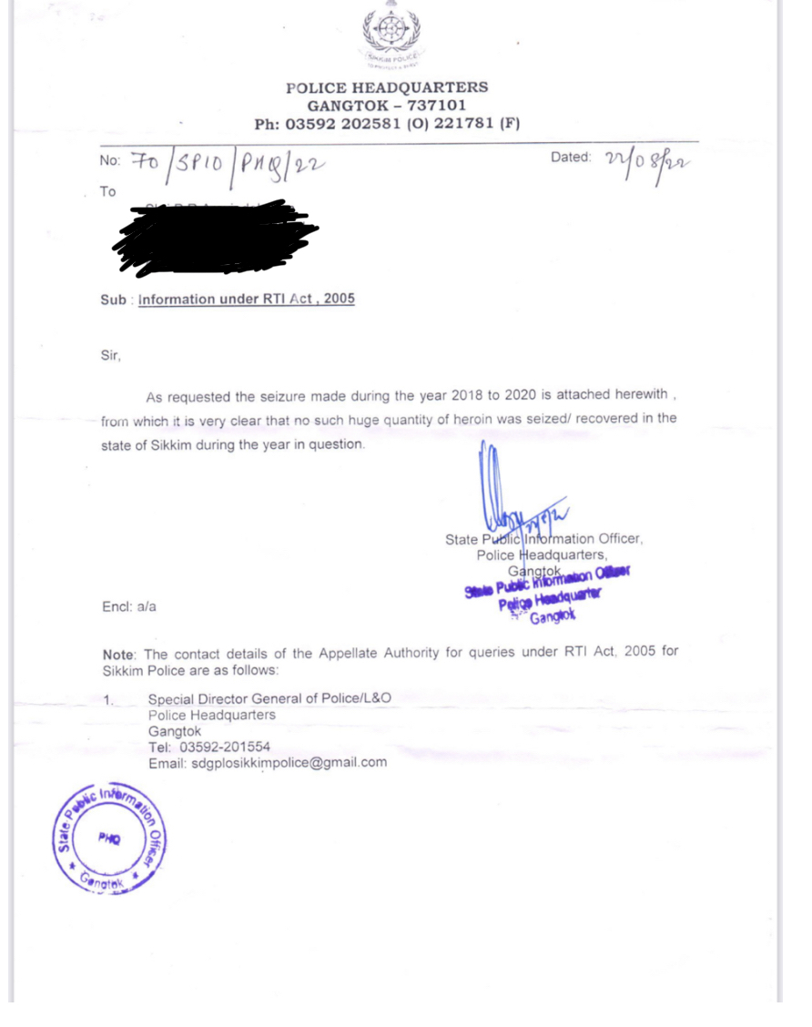 The Sikkim State Police HQ has given us an answer that apparently not so much heroin has been seized in the state of Sikkim.