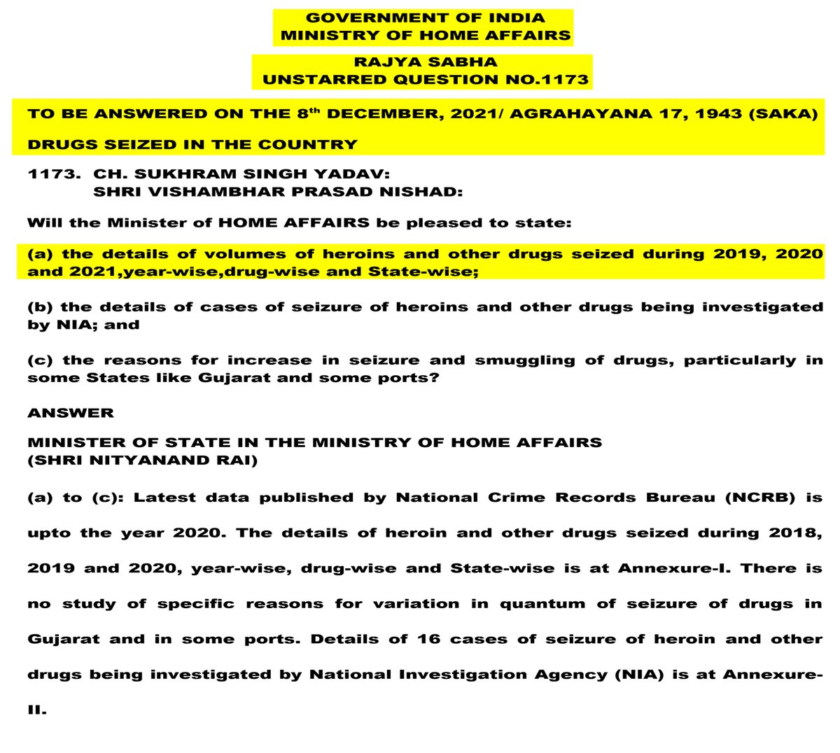 The Ministry of Home Affairs, which has given a written reply three times in the Parliament, has given the details of who seized 68200 kg of heroin.