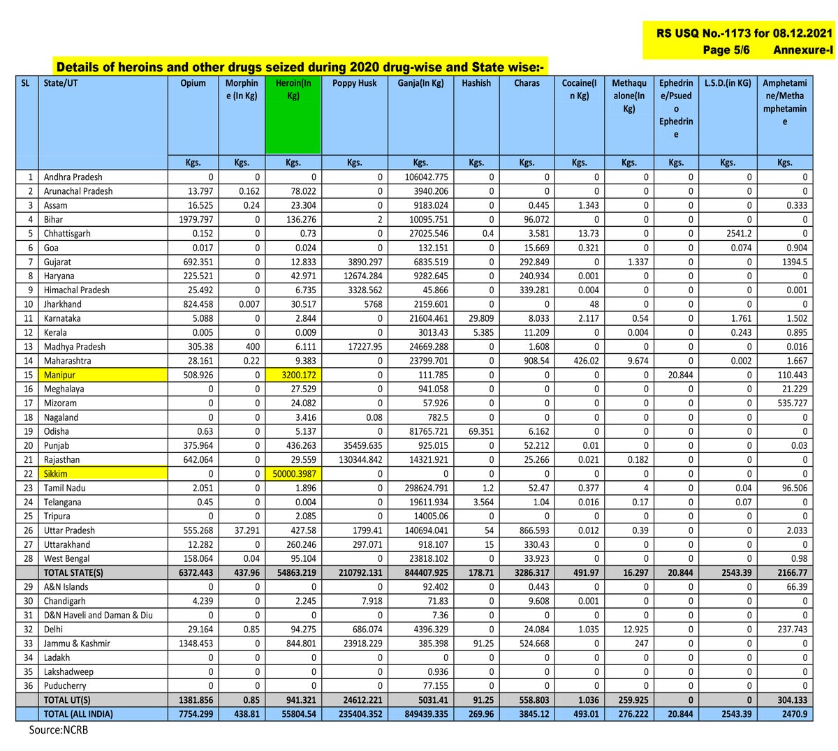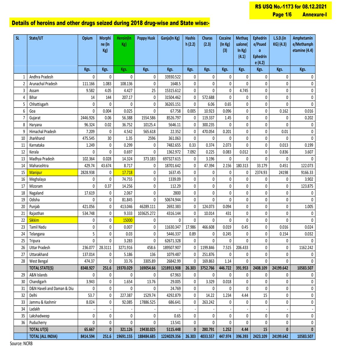 Referring to the reply given in the Rajya Sabha regarding the seizure of heroin, we had raised the question as to which agency had seized the heroin in the state of Sikkim and Manipur...