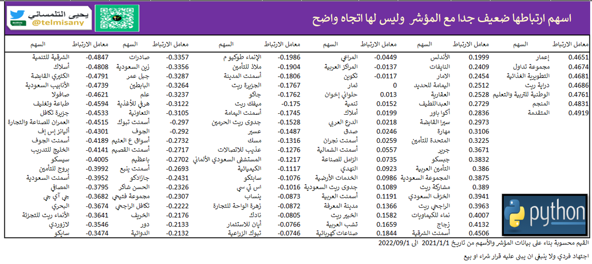 في النهاية جميع هذه المعلومات استرشادية فقط ولا ينبغى ان يبنى عليها قرار شراء او بيع. ان شاء الله سيتم حساب معامل الارتباط لجميع الاسهم ببعضها البعض ونشرها لاحقا ان شاء الله وهو عمل كبير ويستلزم وقت وجهد عالي في البرمجة