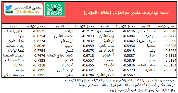 الارتباط عكسي أي ان هذه الأسهم تخالف المؤشر في حالة الصعود أو الهبوط