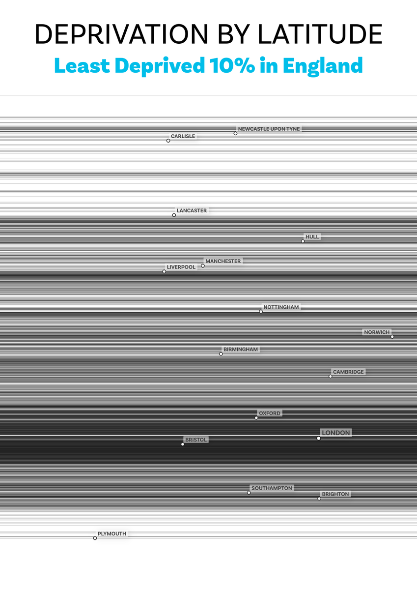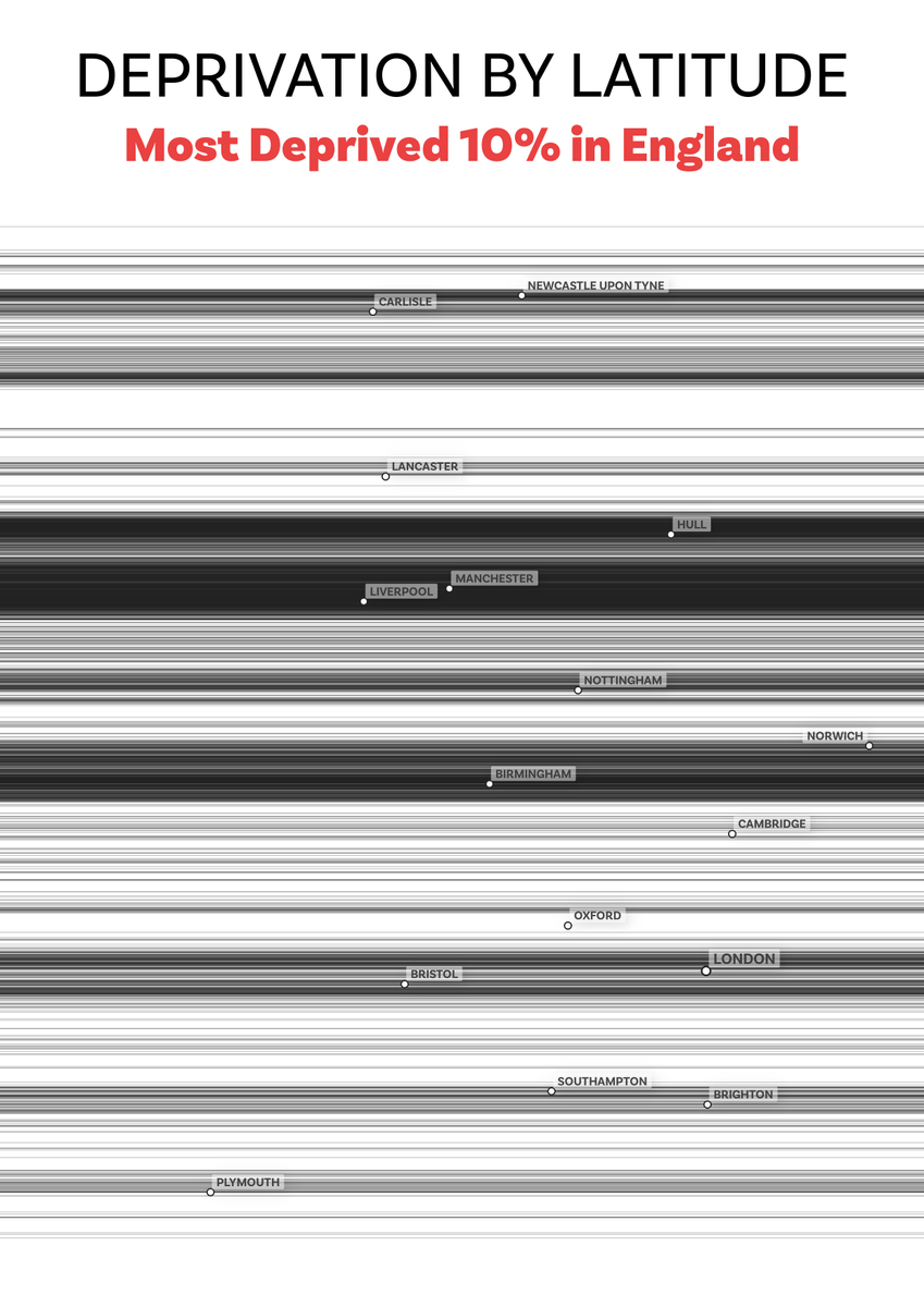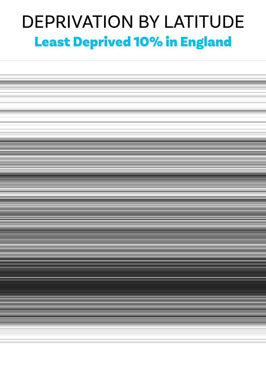 Map of the day today is deprivation in England in a barcode style plot - showing the latitude of the 10% least deprived vs 10% most deprived (IMD 2019)