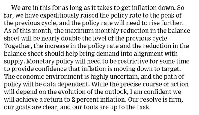 Brainard's speech contains a number of reasons to expect inflation to come down: aggressive policy tightening and fiscal drag, higher markups that could reverse, and still-anchored expectations.