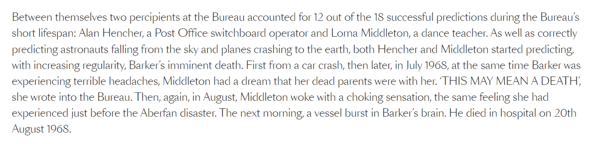 British psychologist John Barker founded, the Premonitions Bureau, in order to predict future calamities by collecting "visions" from clairvoyant members of the general public, figures whom Barker termed βpercipientsβ.