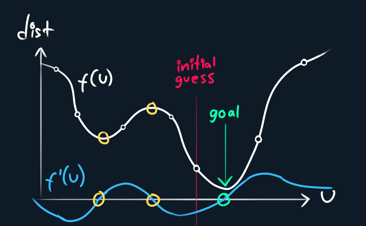 • let's define a function f(u) that returns the squared distance between the ray and the spline