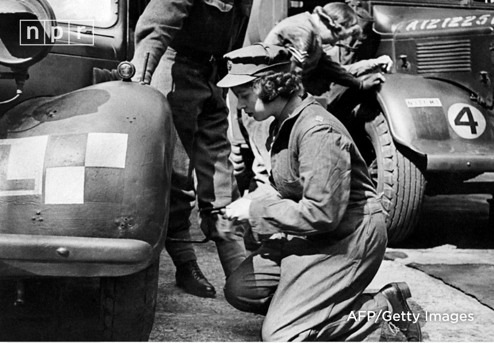 Princess Elizabeth changes the wheel of a military vehicle during the World War II.