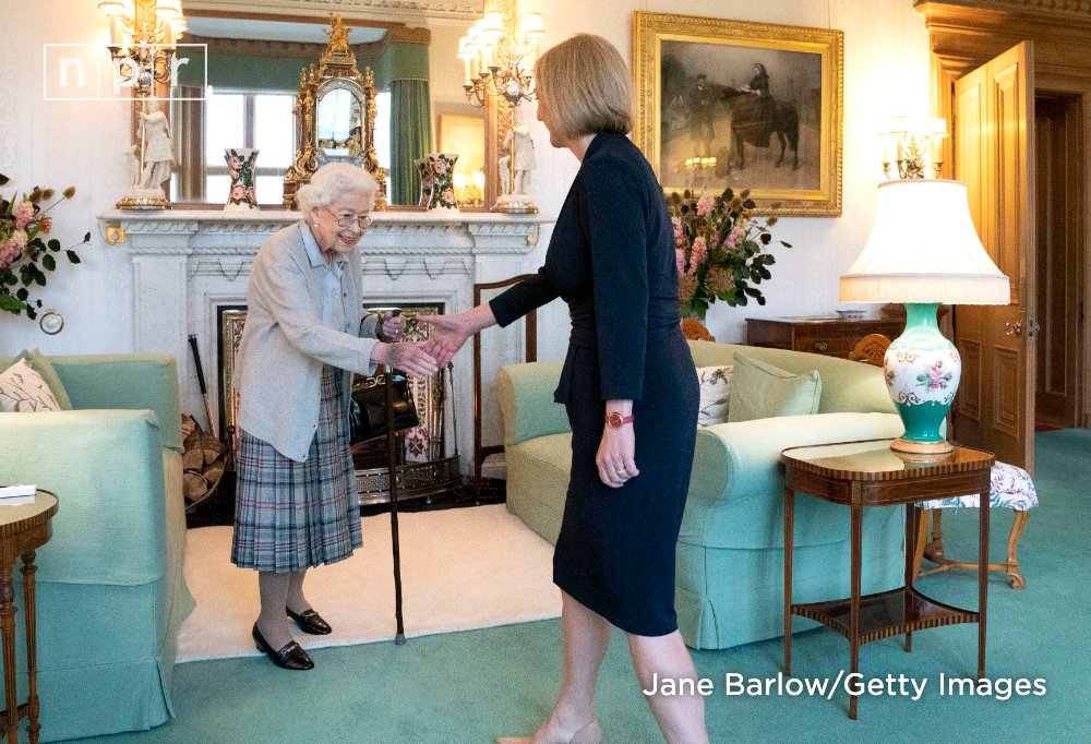 Queen Elizabeth greets newly elected leader of the Conservative party Liz Truss as she arrives at Balmoral Castle for an audience where she will be invited to become Prime Minister and form a new government on September 6, 2022 in Aberdeen, Scotland.