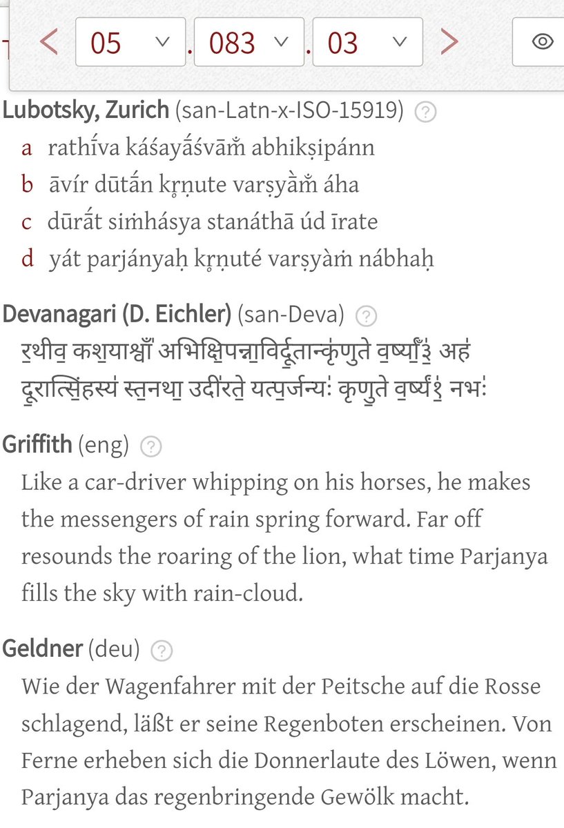 .. resounds from afar (दू॒रात्सिं॒हस्य॑ स्त॒नथा॒ उदी॑रते॒). He's also implored to withhold rain (षू गृ॑भा॒य) after shedding it (अव॑र्षीर् व॒र्षम्). Like Sóma, Parjánya is likened to a bull, though with a certain confusion of gender (because clouds are otherwise cows).