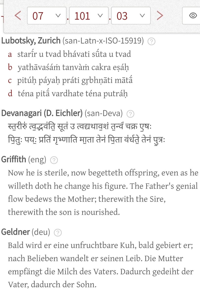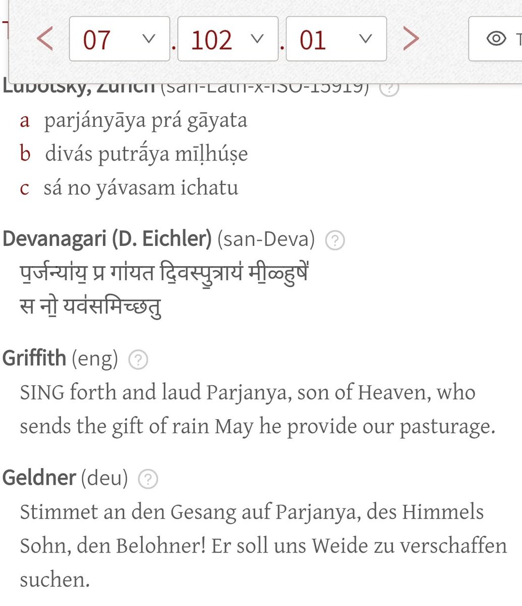 .. to the character of Dyaús (e.g. thundering: स्त॒नय॑न्निव॒ द्यौः), whose son he is once called (प॒र्जन्या॑य॒ प्र गा॑यत दि॒वस्पु॒त्राय॑). In turn Parjánya himself is said to be the father of Sóma (प॒र्जन्यः॑ पि॒ता म॑हि॒षस्य॑ प॒र्णिनो॒), who's likened to a an eagle when he ..