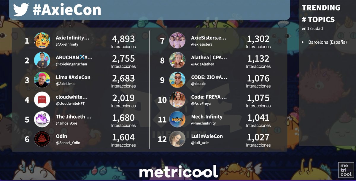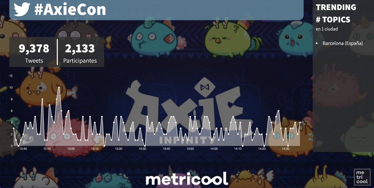 @Joswhar @mechinfinity @AxieInfinity_ES ¡Se consiguió! #AxieCon es oficialmente #TrendingTopic en Barcelona 🎮👻 Seguimos acercándote las métricas 📈☝🏻 más relevantes de este congreso...