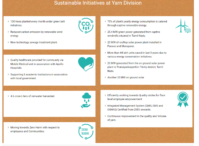 Sustainability - The yarn division is using sustainable cotton to the extent of 50% during the current year and it is benchmarking to use around 90% sustainable cotton over a period.