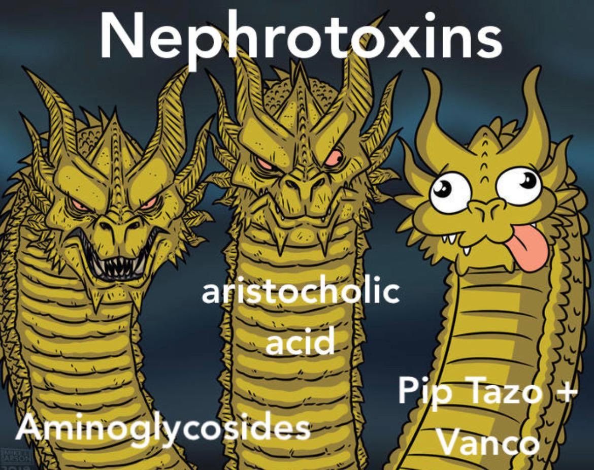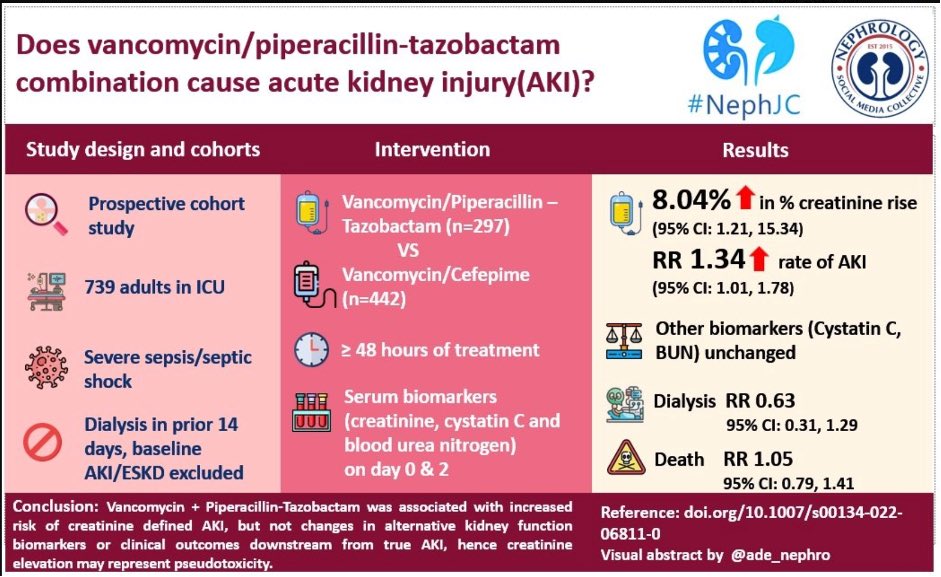 50+ observational studies have linked the vancomycin/pip-taz combo with AKI. However, most only used creatinine as their injury biomarker, & evidence for ⬆️dialysis is limited