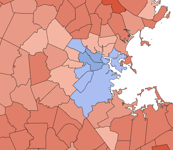 @jacremes @TomSugrue (Actually, probably not--I hadn't realized how close that race was in Boston proper, just 3K votes. Those margins in Quincy and Waltham etc. could probably swamp out Camberville. But that's the exception that proves the rule; it takes a candidate who could plausibly win Boston.)