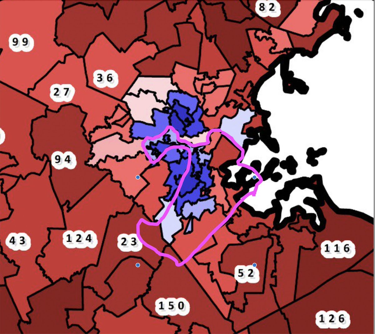 @jacremes @TomSugrue Here are the state senate districts by their vote in the 2018 Baker landslide.I tried to vaguely trace the city borders in purple. These have the additional benefit they ought to be equal-population... Absolute-worse-case, you're getting 6 additional D strongholds.