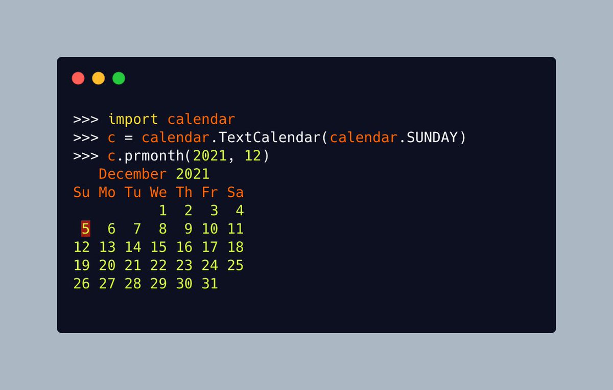 Here is how you would use #Python's calendar in code instead of in the terminal: