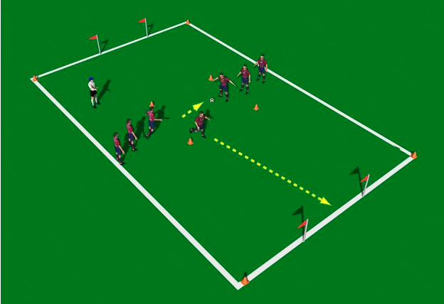 In that queue, the player sprints to either side and through the flag poles. His partner has to read the correct side and try to beat him past the end line. Resting players must step up and keep the passing tempo going quickly. Only take 3-4 passes before sprinting.