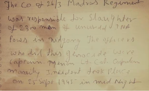 Col GS Dhillon's diary reads: "Slaughter of 2,300 men of INA PoWs in Nilganj"