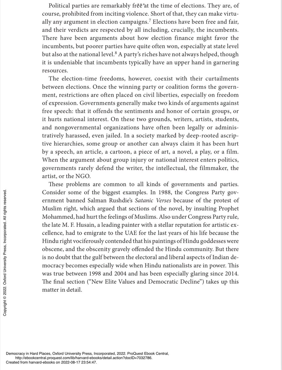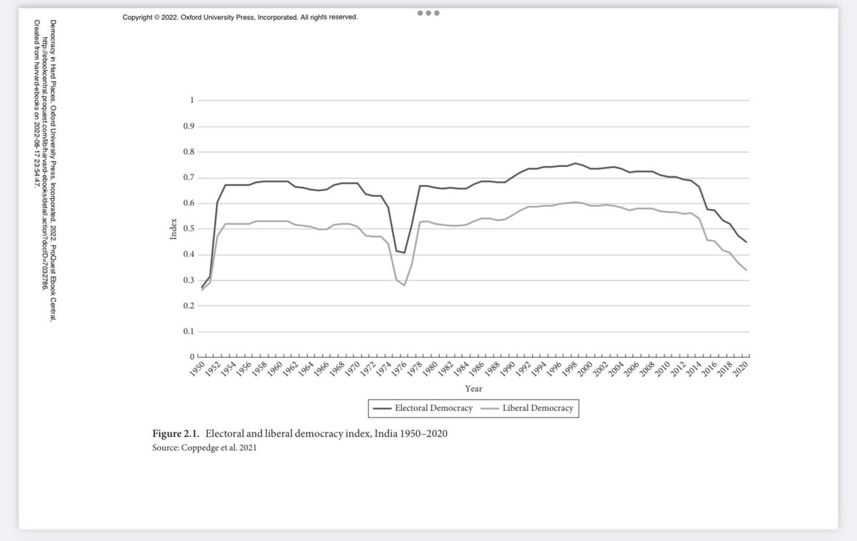For those asking: The book is “Democracy in Hard Places” edited by Scott Mainwaring and Tarek Masoud. @ProfVarshney’s chapter is titled “India’s Democratic Longevity and its Troubled Trajectory.” It’s a must read for anyone interested in the subject.