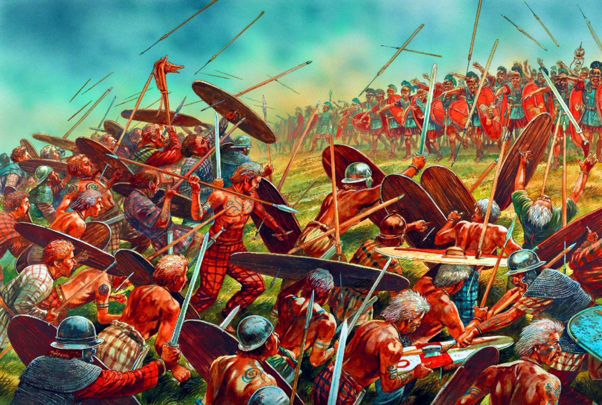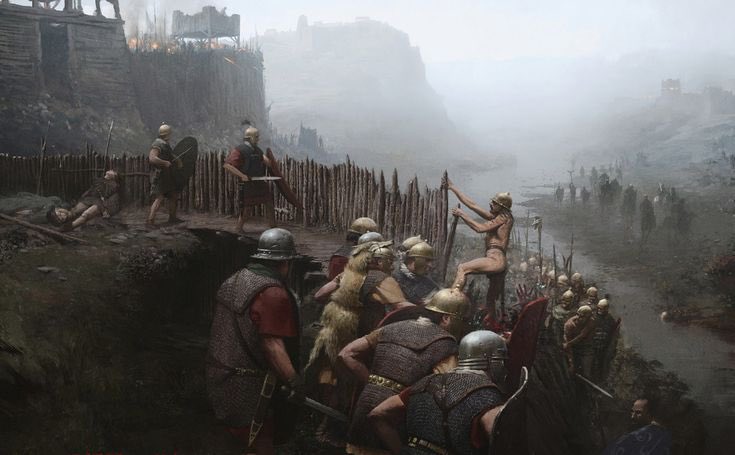 The Gauls would mass disorganized charges & plunge toward trenches, stakes, moats, & palisades under withering javelins, ballista bolts, & arrows only to reach lines of disclipned legionaries, gladius in hand, or devastating cavalry charges.