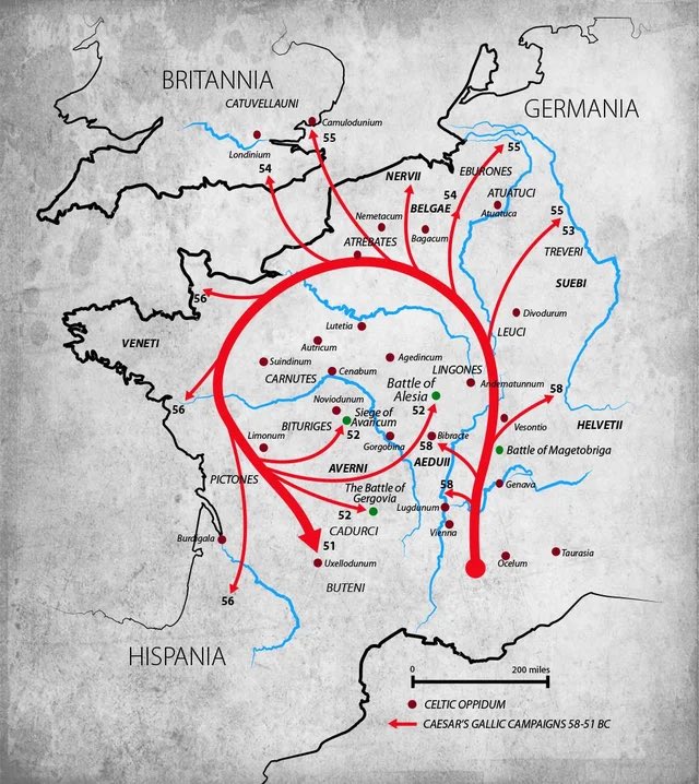 This can be attributed, in part, to Caesar’s total success in Gaul providing him with public adoration, glory, riches, & loyal veterans destabilizing the delicate balance of power in Rome. As for Gaul, its Celtic character will melt away as it Romanized under the Empire’s rule.