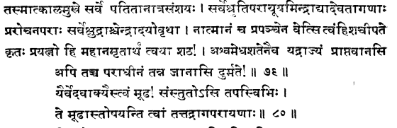A similar scathing attack on the Aindra/Daiva religion can be found in the Skāndapurāṇa, where both the Devas headed by Indra as well as the Ṛṣis praising them in the Veda are harshly castigated for, respectively, their addiction to praise & to material desires.