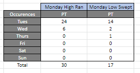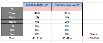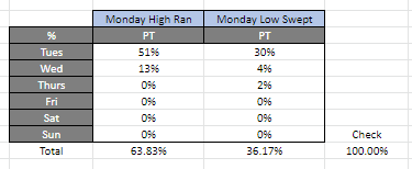 From the data, I found that during a Pro Trend, there's a combined 81% of price interacting with the Monday low or high