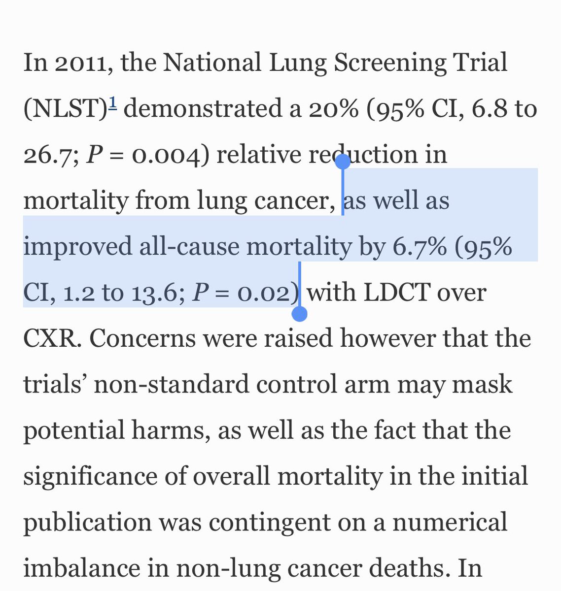 It’s also worth pointing out that even though none of these studies was powered for all-cause mortality, there actually is a strong (albeit not quite statistically significant) signal that screening CT scans *do* reduce all-cause mortality.