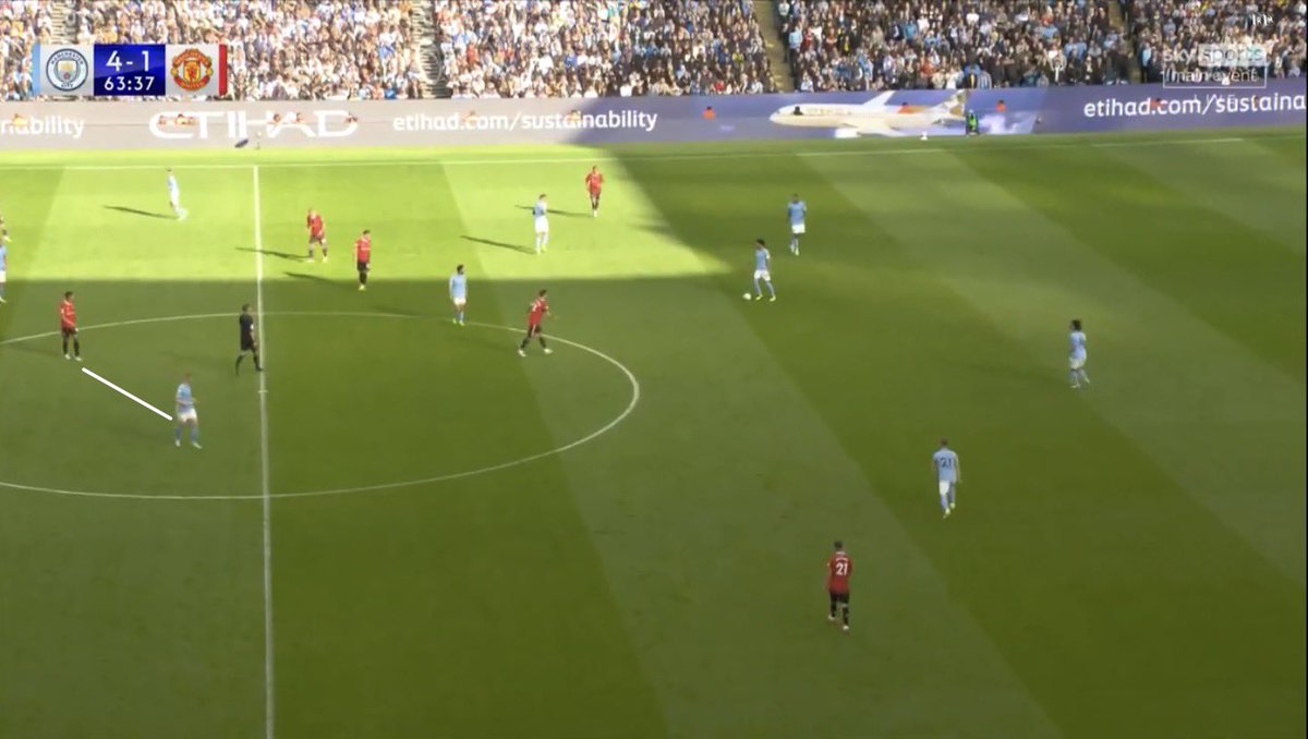 Guardiola is giving De Bruyne the freedom to stay high out of possession. He’s facilitating his transition threat and in a match like yesterdays, where United were committing bodies forward when they attacked, it can be deadly 12/
