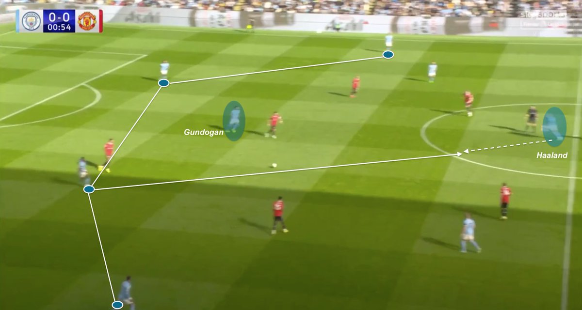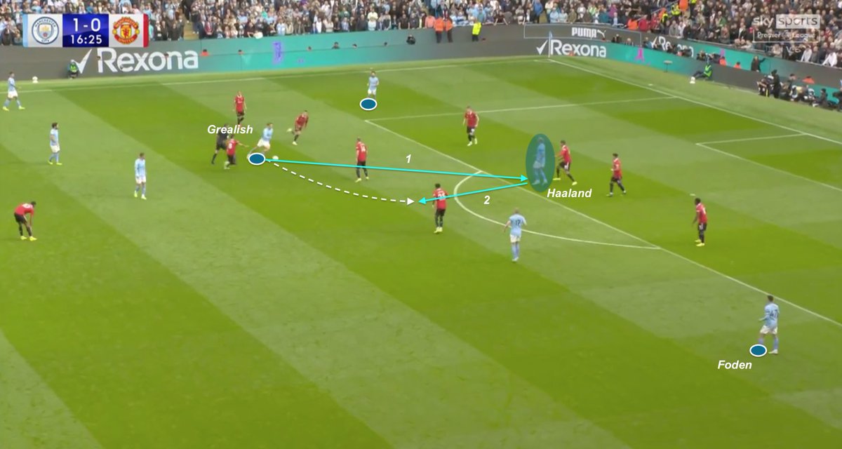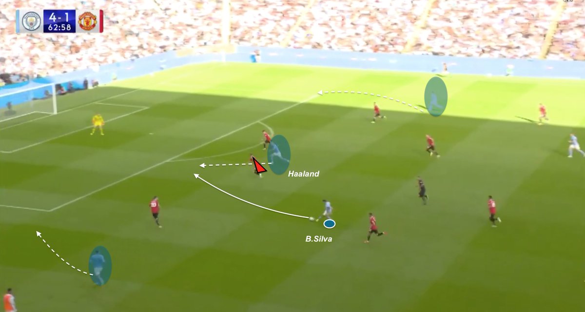 City’s wingers (Foden and Grealish) use to start their runs from the touchline and suddenly accelerate (same runs as Gabriel Jesus). Considering Haaland as a point guard is another offensive pattern Man City could capitalize on.