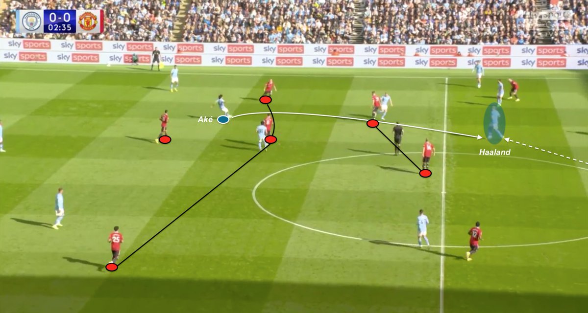 Looking for wide wingers as soon as Haaland gets the ball constrains Man United to stretch the central defensive line implemented by Ten Hag, easing out Haaland’s runs that we will dissect later on.