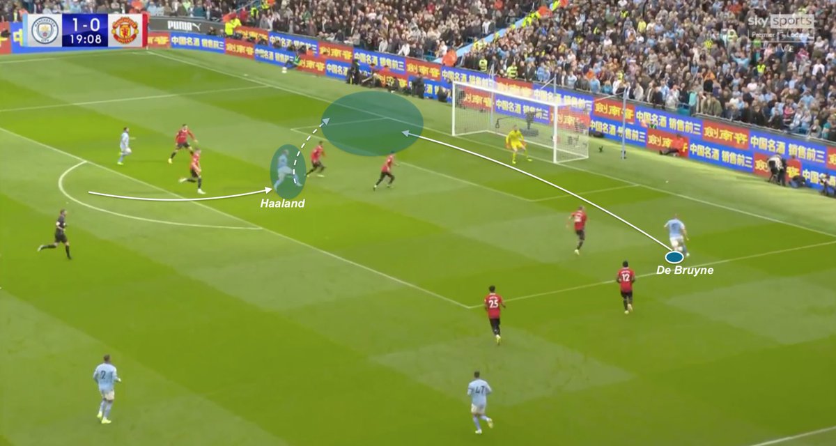 As United defended with a low-block, Haaland didn’t get enough chances to run in behind in central spaces. However, in second half, given United was forced to apply another strategy, Haaland had more opportunities to do this kind of runs., these are devastating, thanks to
