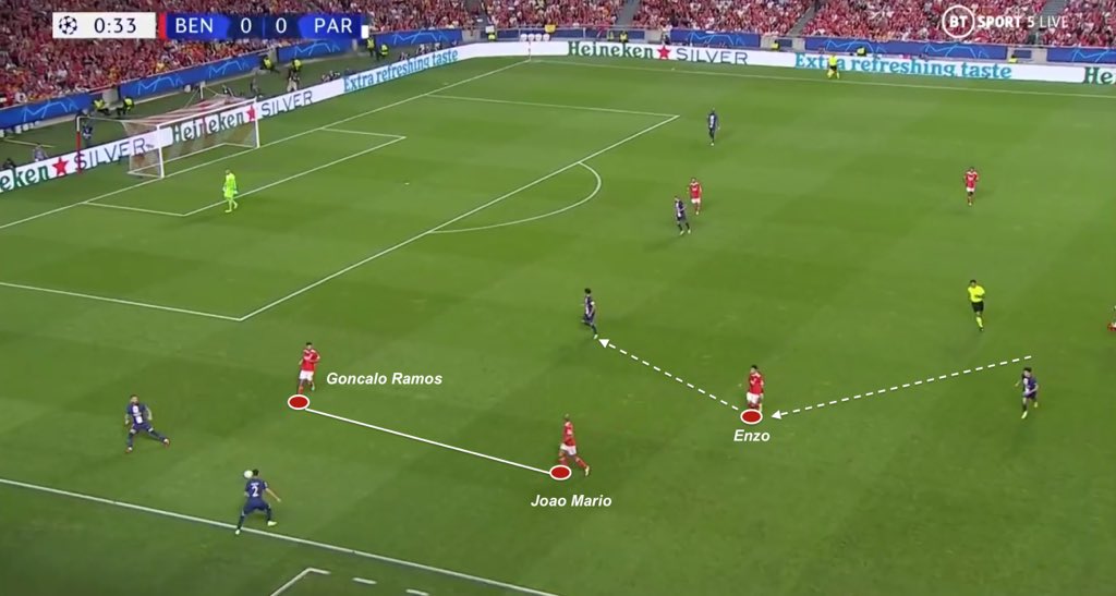 Verratti dropping as central defender, Vitinha was the main danger as he moved perfectly into Benfica’s structure. If he receives, he looked for width as much as possible. To avoid that, Enzo-Luis had a clear mission : constant man-marking.