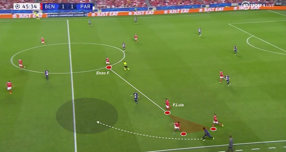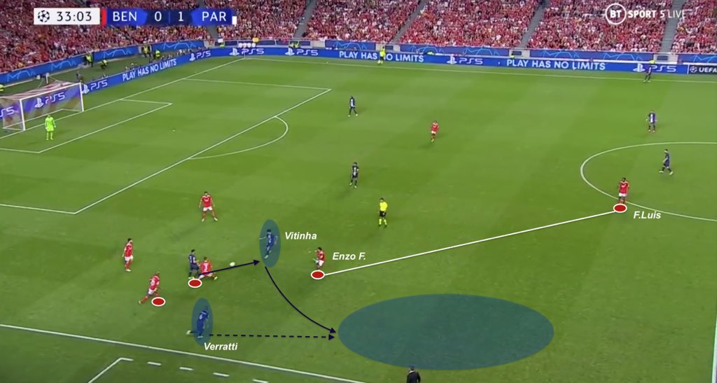 Here it is. In this situation, PSG’s double pivot managed to bypass Benfica’s high pressing. As F.Luis and Fernandez increase distances, Verratti can attack that space and illustrates how good can PSG control width.