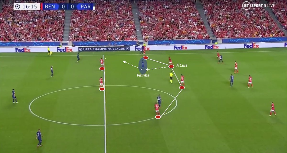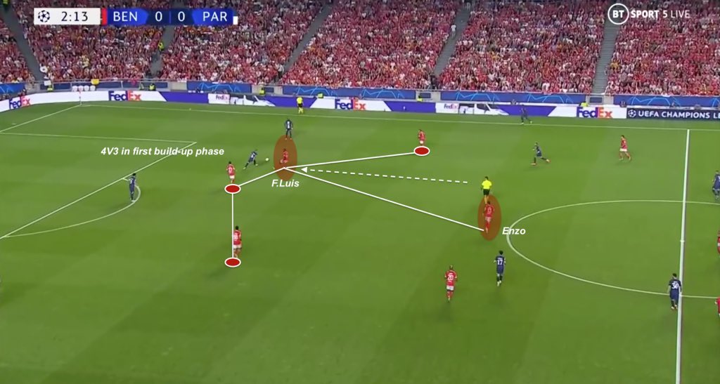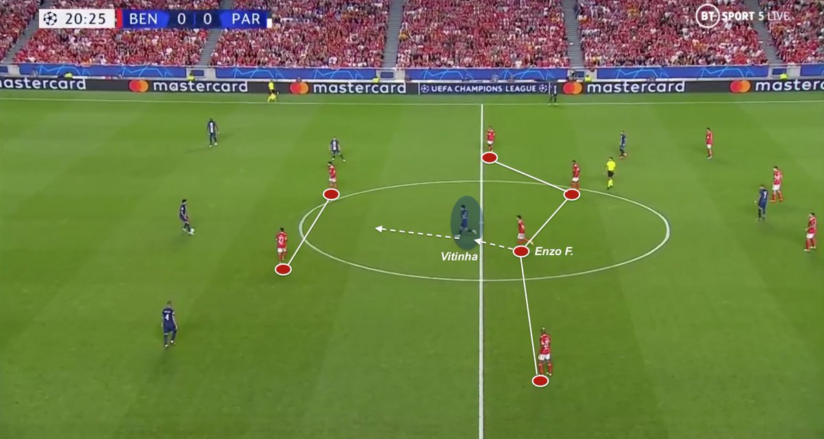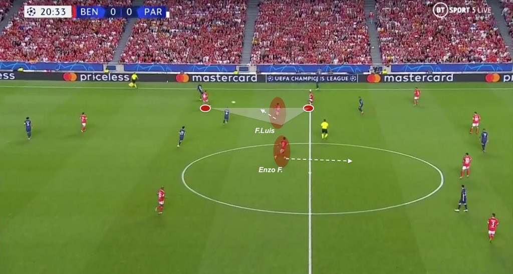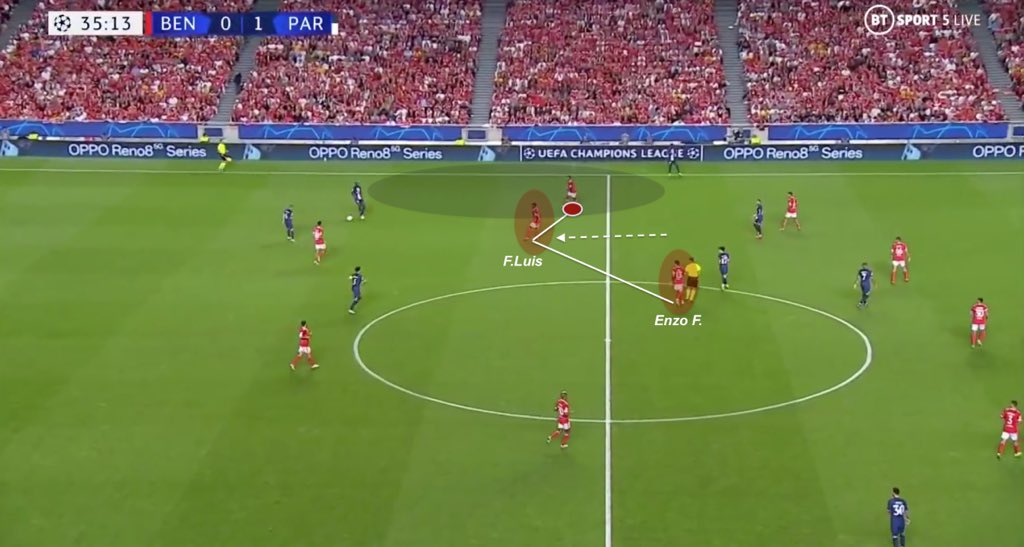 Given Benfica’s high line of pressure, Enzo’s runs to control Marquinhos activity, and consequently PSG’s wide build-up, has been precious to recover the ball high. Florentino Luis stays as holding midfielder in this kind of situation.